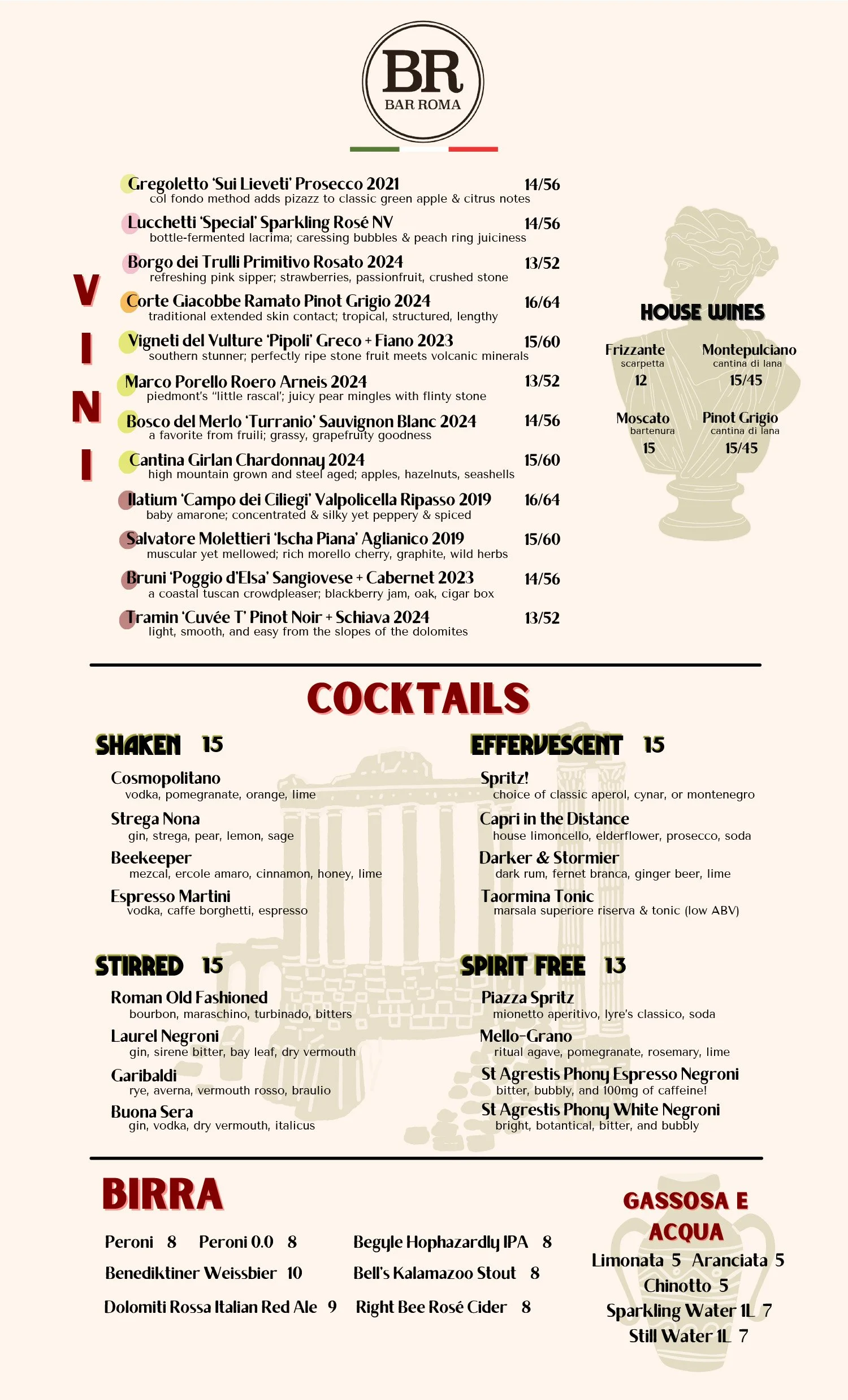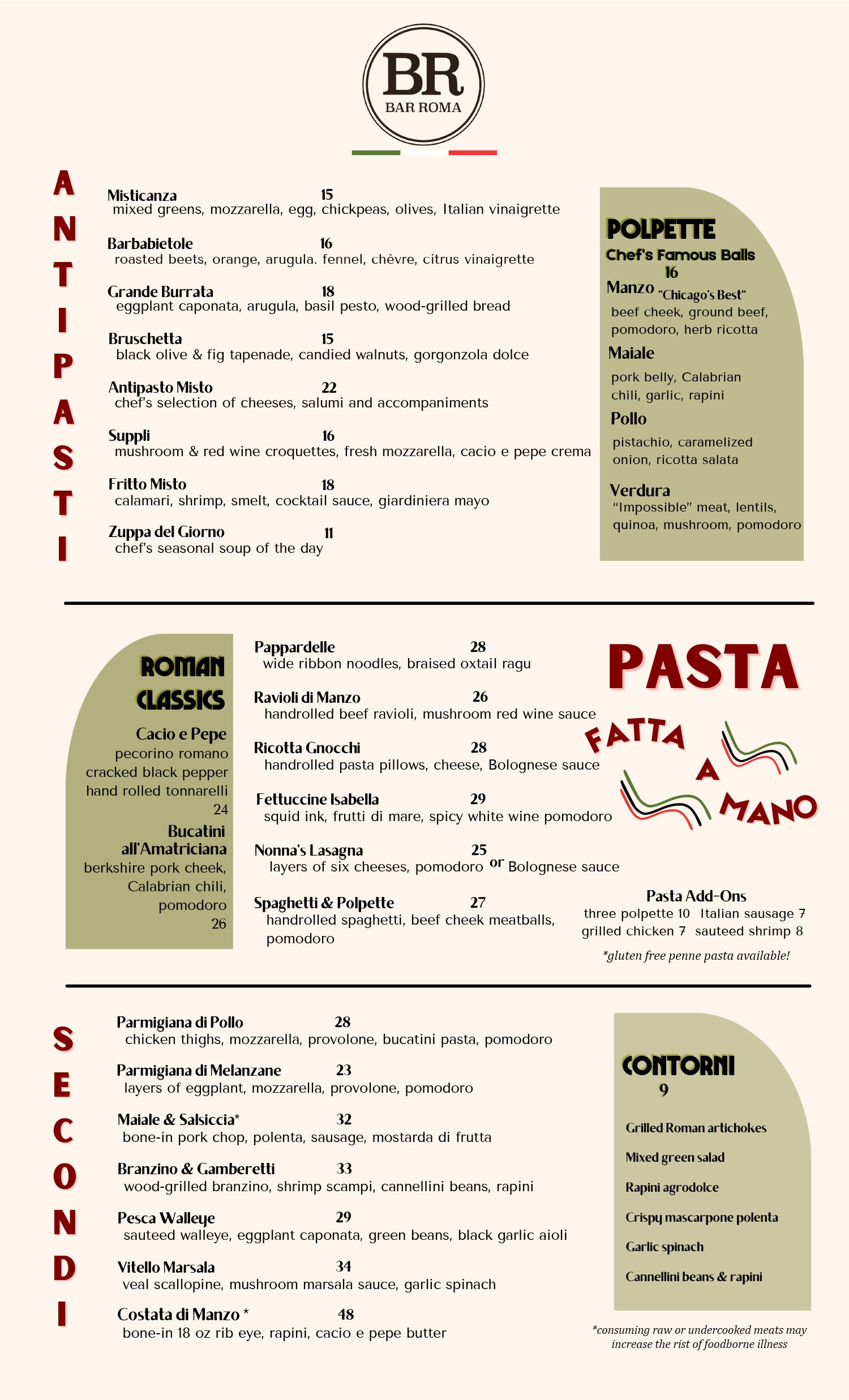 A welcome addition to Andersonville’s ever-evolving dining scene. Bar Roma specializes in meatballs, house made pasta and wood-fired dishes highlighting the cuisine of Rome, Italy. Our spacious bar welcomes guests for creative, Italian-focused craft cocktails and notable wines curated by local industry innovators. In addition to dinner nightly, we offer private events, and on or offsite catering.