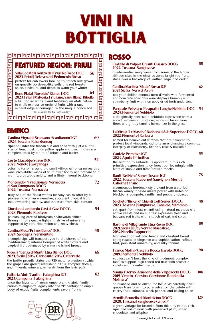 We can comfortably accommodate up to 45 guests in a semi-private area in the main dining room (with regular dining service also in place). Bar Roma's forum area, set in the back section of our tavern, provides an intimate and warm dining experience for up to 16 guests.